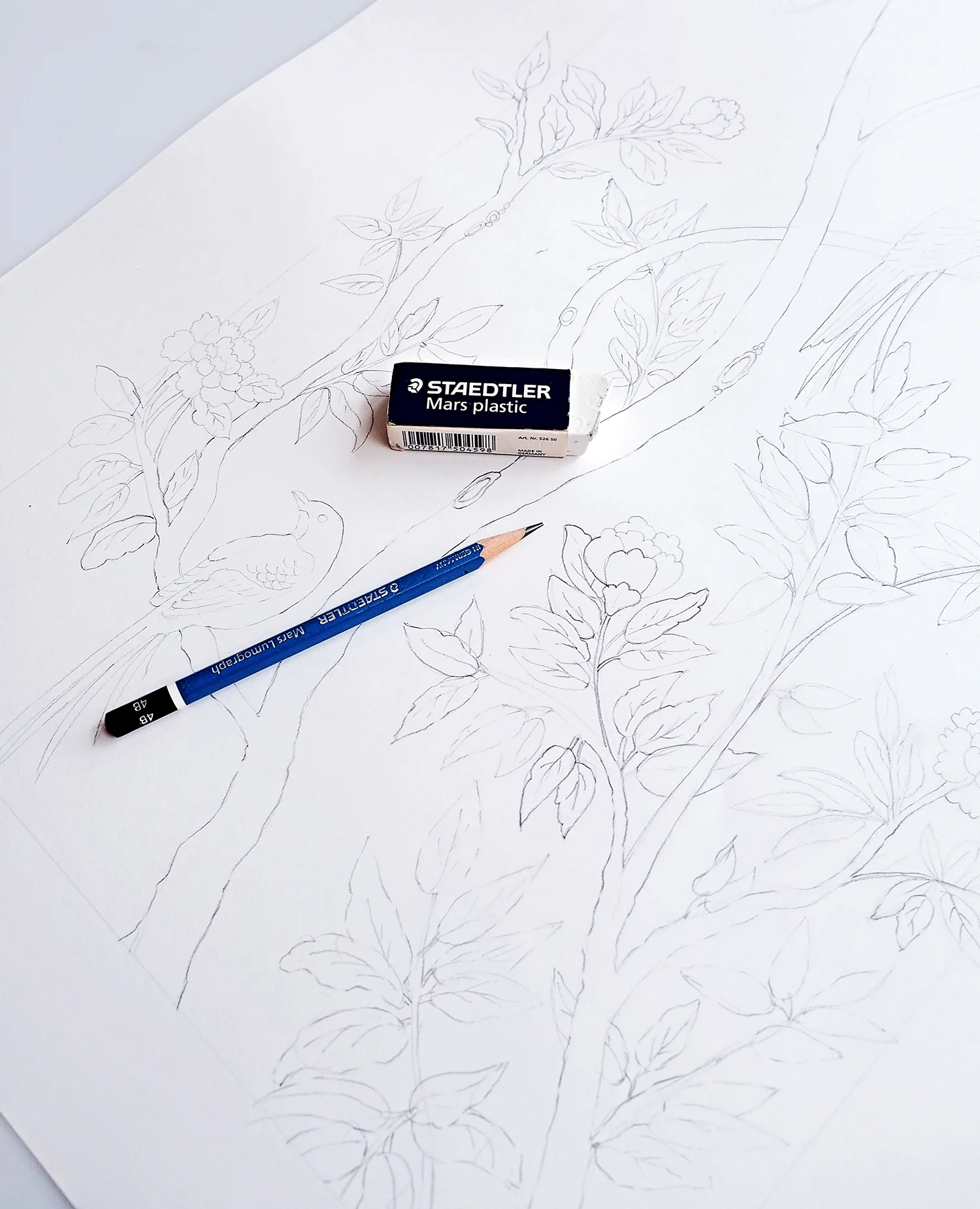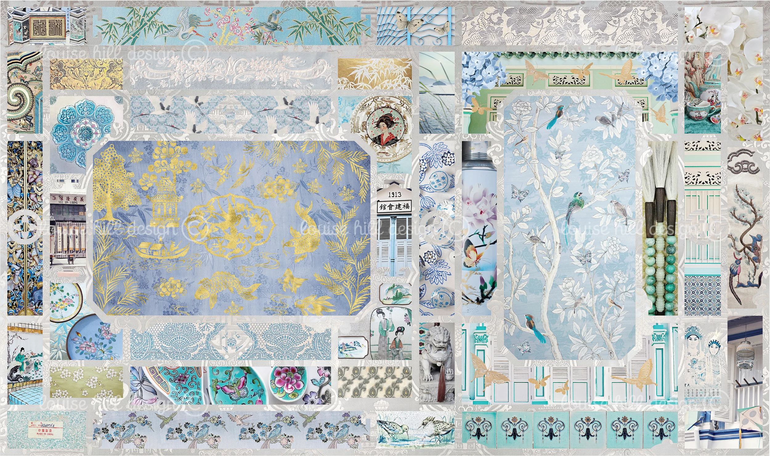Continuing on from the first limited edition print, Chinoiserie in Neutrals, I created a silk "window frame" for the images to sit within inspired by the ornate wooden screen in my old studio. I really enjoyed painting the two main feature panels and the individual design elements. These include the main 'Chinoiserie" botanical wallpaper and the birds, gold fish and butterflies in gold inks. The print is complex and highly detailed and I have featured many curated pieces, accumulated and collected over several years which make up it’s story. I love the old Chinese packaging label from an embroidered box which is faded and worn showing it's history, the vivid teal hand painted tea set, the vintage Indian sari fabrics and the pieces of porcelain bought at the floating water markets in China.